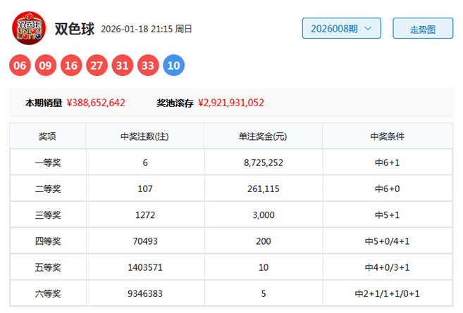双色球第2026008期奖号为:06、09、16、27、31、33+10。