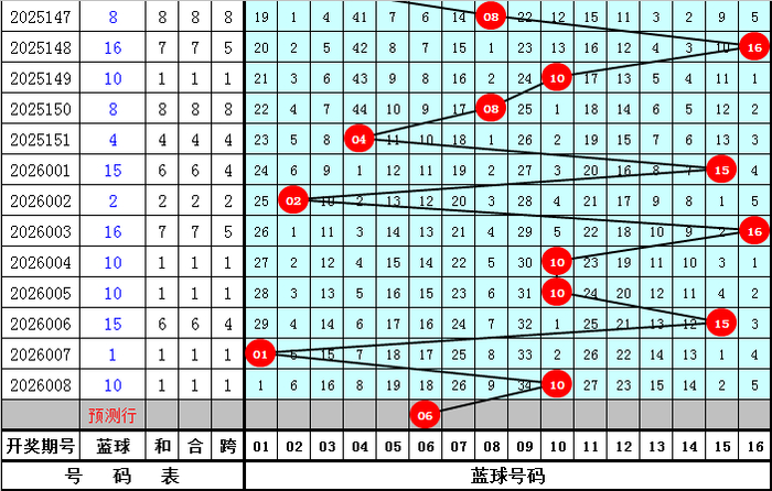 蓝球尾数分析:最近7周星期二开出3个蓝球尾数,重复蓝球尾数明显活跃,本周星期二注意蓝球尾数为近期热码尾数,参考蓝球06。